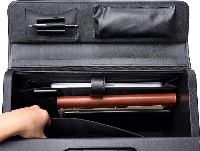 - Features : Our laptop carrying case flap-over section comes with organizer that includes a card slot, two pen slots, and a small zipper pocket that measures 8” x 3” x 1.5”. Closure has secure dual combination locks can be individually set. Laptop cases front pocket expands 2 inches and has a button latch. Side pockets each measure 6” x 1 3/8” x 9”. Spacious enough for A4 and legal sized documents.