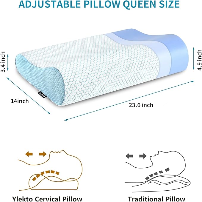 - 2 Adjustable Heights for Any Sleep Style: The foam pillow is with size: 23.6 x 14 x 4.9/3.4 inches ( L x W x H). There are two available neck support heights to support your neck and head. The ergonomic and supportive pillow for neck pain is designed for multiple sleeping positions, such as side sleeping, supine, stomach sleeping, back sleeping and low pillow sleepers etc.
