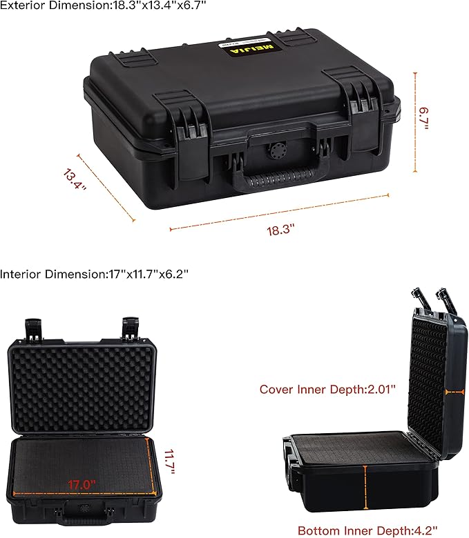 - ▶Outside Dimension:18.3"x13.4"x6.7".Inside Dimension:17"X11.7"X6.25".Cover Inner Depth:2.01".Bottom Inner Depth:4.2". Weight with foam:7.10 lbs.The perfect compact size offers full protection for most mid-sized DSLR/mirrorless kits with 1-2 lenses or serves as an excellent case for drones, audio gear, tools, or other valuables requiring serious protection
