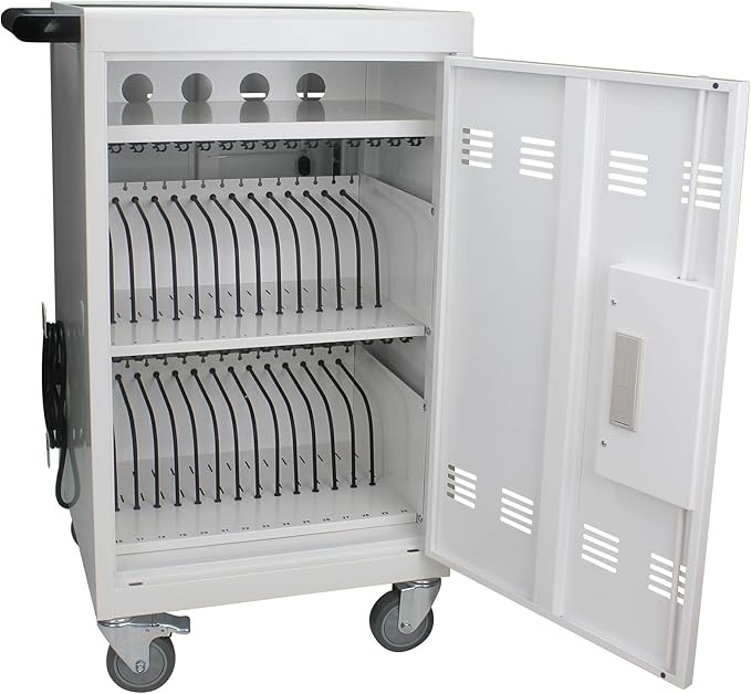 - 【CHARGE & STORE 32 DEVICES】: 30 padded bays, and an extra shelf allow you to store and charge 32 devices at one time, in a secure, space-saving, versatile, mobile cart.(Top shelf for extra charging and storage space)