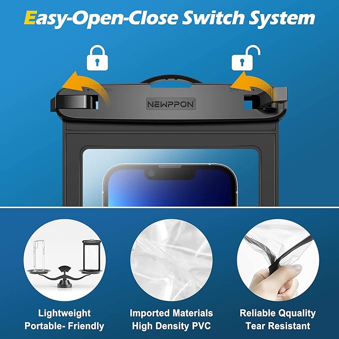 - 【Important Notice】This Waterproof Holder comes with a sturdy lanyard for easy carry, featuring a snap-off design for quick release. Before use, read the instructions thoroughly. Perform a waterproof test with a dry paper towel, remove air before sealing, and soak for 10 mins. Ensure no top mount blockage to prevent leaks. For issues, contact us; we'll respond within 24 hours.