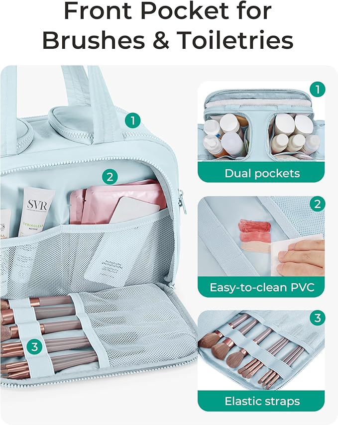 - Easy Access and Keep Upright : Full opening and not piling up for easy access to items. Double side full open design of travel bag for toiletries keeps cosmetic bottles and toiletries can stand upright in the middle compartment. Avoid leakage during transit