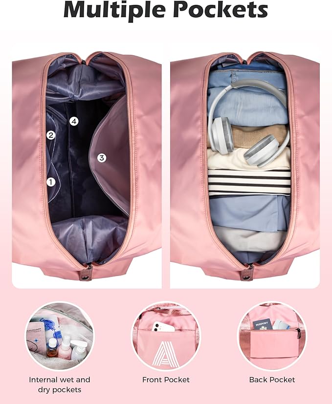 - High Capacity Overnight Bag for Women:Gym tote bag is designed with 3 internal and 2 external organizational pockets, providing ample space for your belongings. The bag is spacious enough to hold a large amount of clothes for a short trip.In addition, this outing bag also comes with a drawstring shoe bag, which makes your travel more convenient.