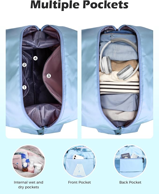 - High Capacity Overnight Bag for Women:Gym tote bag is designed with 3 internal and 2 external organizational pockets, providing ample space for your belongings. The bag is spacious enough to hold a large amount of clothes for a short trip.In addition, this outing bag also comes with a drawstring shoe bag, which makes your travel more convenient.