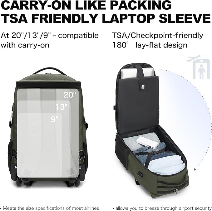- TRAVEL COMPANION: This backpack with wheels is convenient for security checks, it is designed to meet most airline carry-on baggage requirements and fits easily into the overhead rack. Its multi-purpose design provides convenience for student parties and business travelers, this classic multi-functional backpack is the best choice for students and travelers for roller backpacks, college student backpacks with wheels, and business rolling backpacks