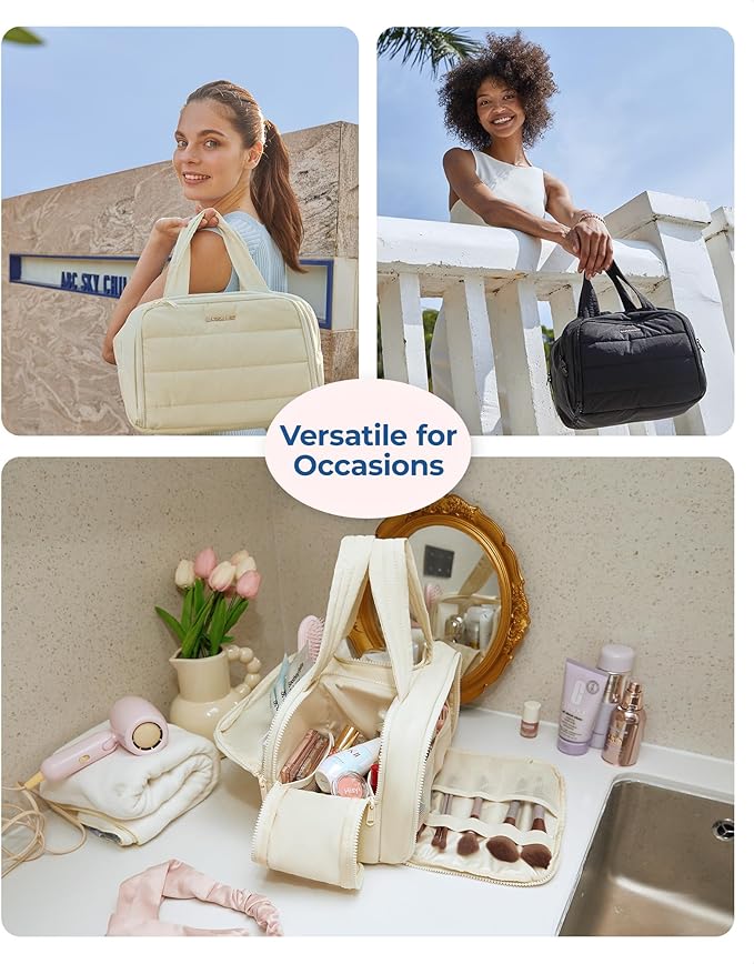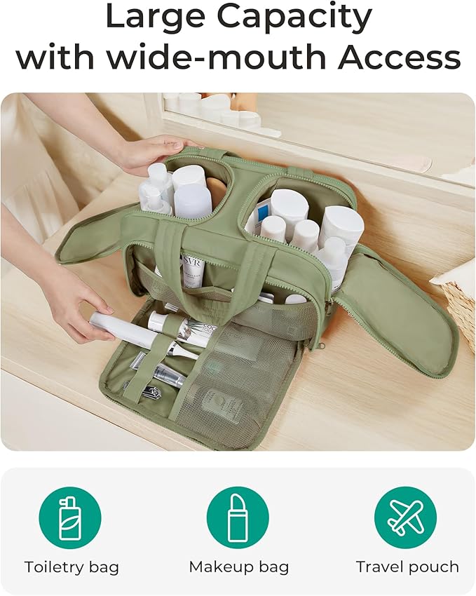 - Easy Access and Keep Upright : Full opening and not piling up for easy access to items. Double side full open design of travel bag for toiletries keeps cosmetic bottles and toiletries can stand upright in the middle compartment. Avoid leakage during transit