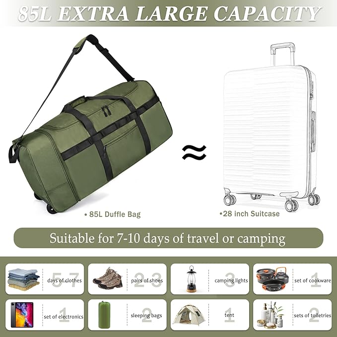 • 【Multi-pocket & Large Capacity】: Capacity: 85L. The travel duffle bag for men with total 6 pockets, includes 1 large main compartment, 1 inner zipper pocket, and 2 inner large mesh pockets, 1 side zipper mesh pocket, and 1 front zipper pocket provide versatile space for your clothes, shoes, toiletries, laptop, iPad, phone, mobile power, camping tent, sleeping bag, camping cookware and other travel/camping essentials keep your personal items organized. Suitable for 7-10 days travel or outdoor adventure, fulfilling your greatest needs and fantasies of a travel bag.