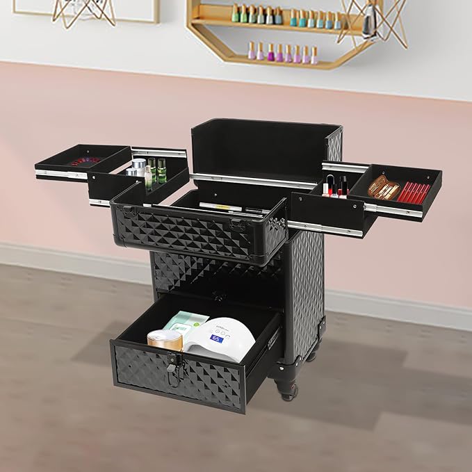 Rolling Makeup Train Case,Multi-functional Cosmetic Trolley with 360° Swivel Wheels Keys,Salon Barber Case Traveling Cart for Nail Technicians Hairstylist (Black)
