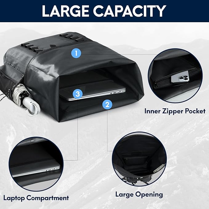 - Waterproof Roll Top Backpack: The sealed roll opening design not only provides an extra layer of waterproofing so you can tightly seal your backpack, but also provides the flexibility to adjust the capacity. A Simple and effective clip buckle ensures a secure closure, keeping your gear safe and dry. 2 different roll closure styles add to the variety of carrying options