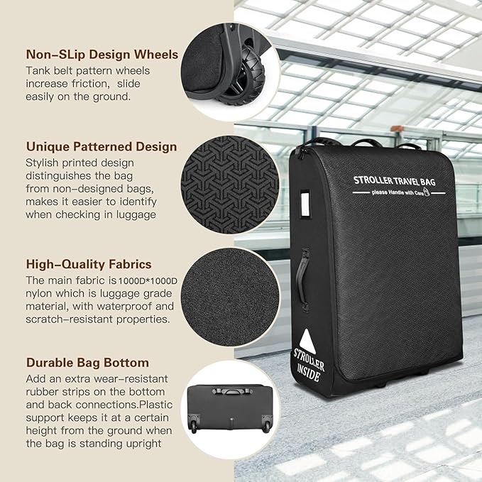 - EASY TO CARRY & FOLDED STORAGE: The baby stroller travel bag with smooth rolling wheels to make your airport walks effortless. The top cushioned grip and two sides grip ensure your hands is comfortable. When not in use,it is easy to folded storage anywhere.