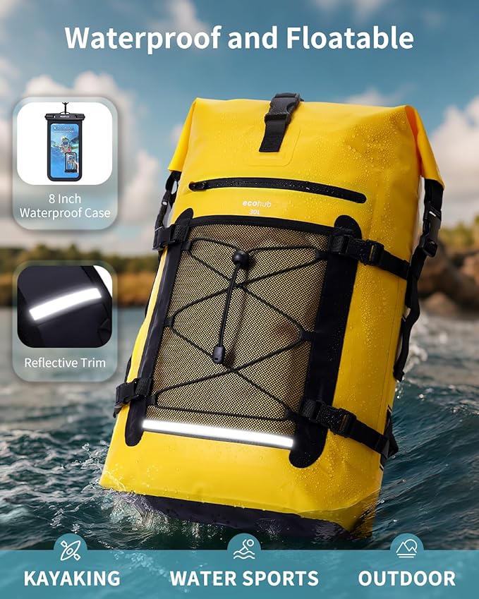 ECOHUB Waterproof Backpack for Women Men, 30L Roll-Top Closure Heavy Duty Dry Bag for Travel with IPX8 Waterproof Phone Case