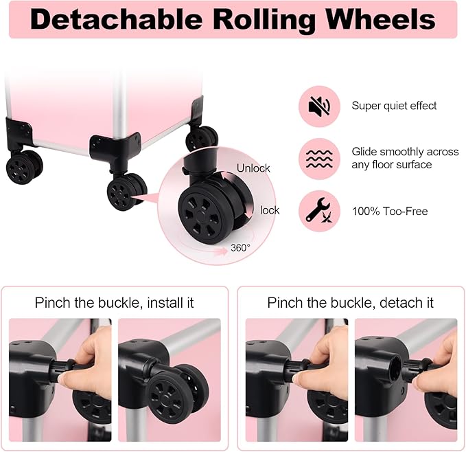 - 【Smooth-Rolling Wheels & Telescopic Handle】Equipped with 360° silent swivel wheels and a sturdy retractable handle for smooth movement on all surfaces—ideal for mobile makeup artists and stylists.