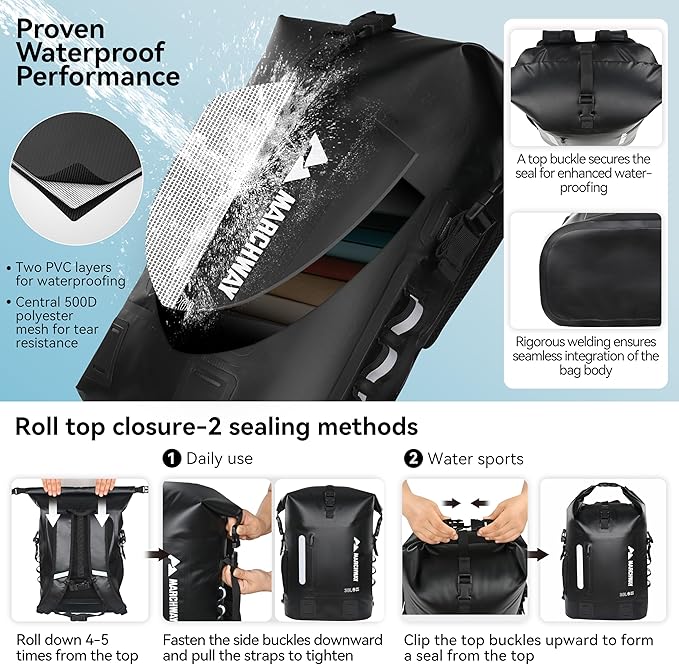 - Robust & Durable: Crafted with waterproof fabric, this dry backpack features dual-layer PVC exterior/interior and a 500D polyester mesh core for exceptional tear, abrasion and wear resistance. Rigorous welding ensures seam integrity, while high-grade buckles, webbing and precision stitching enhance structural strength. Built to endure harsh outdoor conditions, it keeps belongings dry, clean and secure during water sports or heavy rainfall.