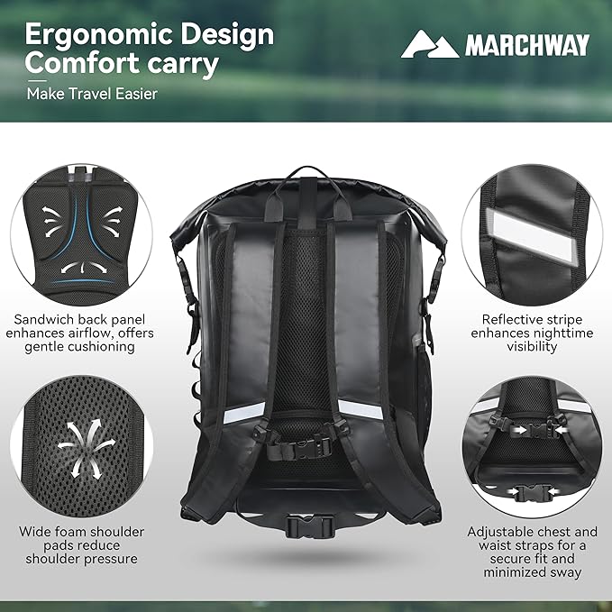 MARCHWAY Roll Top Waterproof Backpack, Floating Dry Bag 20L/30L/45L with Ergonomic Rectangular Base, Cushioned Back, Hip Strap for Hiking Camping Kayaking Travel (Black, 20L)