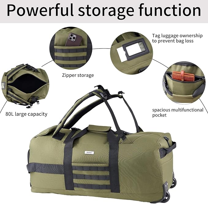 - 【80L Large Rolling Duffle Bag with Wheels】 31.5”x11.8”x12.6” size holds 7-day gear; 3 pounds lightweight build with 8mm shock-absorbing pearl cotton base & 6 rubber bottom pads. 1000D tear-resistant fabric, burst-proof zippers, and reinforced stitching support 88 pounds load, offering military-grade protection for this military duffle bag with wheels on rugged trips, business travels, or outdoor adventures