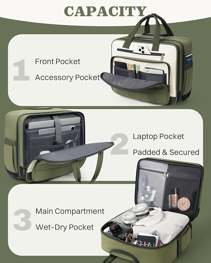 - 【TSA-Friendly 180° Main Compartment & Wet-Dry Pocket】Open the main compartment of this rolling laptop bag flat for hassle-free TSA and security checks. The luggage strap keeps your clothes secured, while the wet-dry pocket separates damp items from the rest of your belongings, keeping everything fresh and organized during travel